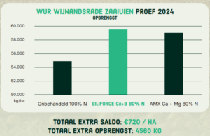 Siliforce Ca+B haalde met een gereduceerde N-gift (80% van de normale N-gift) een opbrengst van circa 59.500 kg/ha. Onbehandeld op 100% bleef dat steken op circa 54.800 kg/ha. Extra saldo: €720/ha.